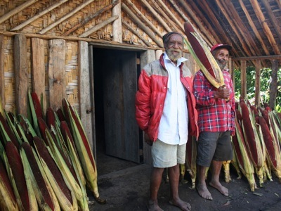 The “marata” (pandanus fruit) was stacked against the wall of the house. They would later stack it on a platform before giving it formally to their inlaws with which they have an exchange relationship. They were given a large gift of “karuka” (a tasty food that grows at high elevations) which they don’t have on their land and in return they are giving these pandanus fruit which their in laws don’t grow.
