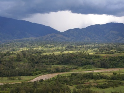 The Wahgi river is in the foreground and the storm clouds are coming in over the southern wall of mountains.